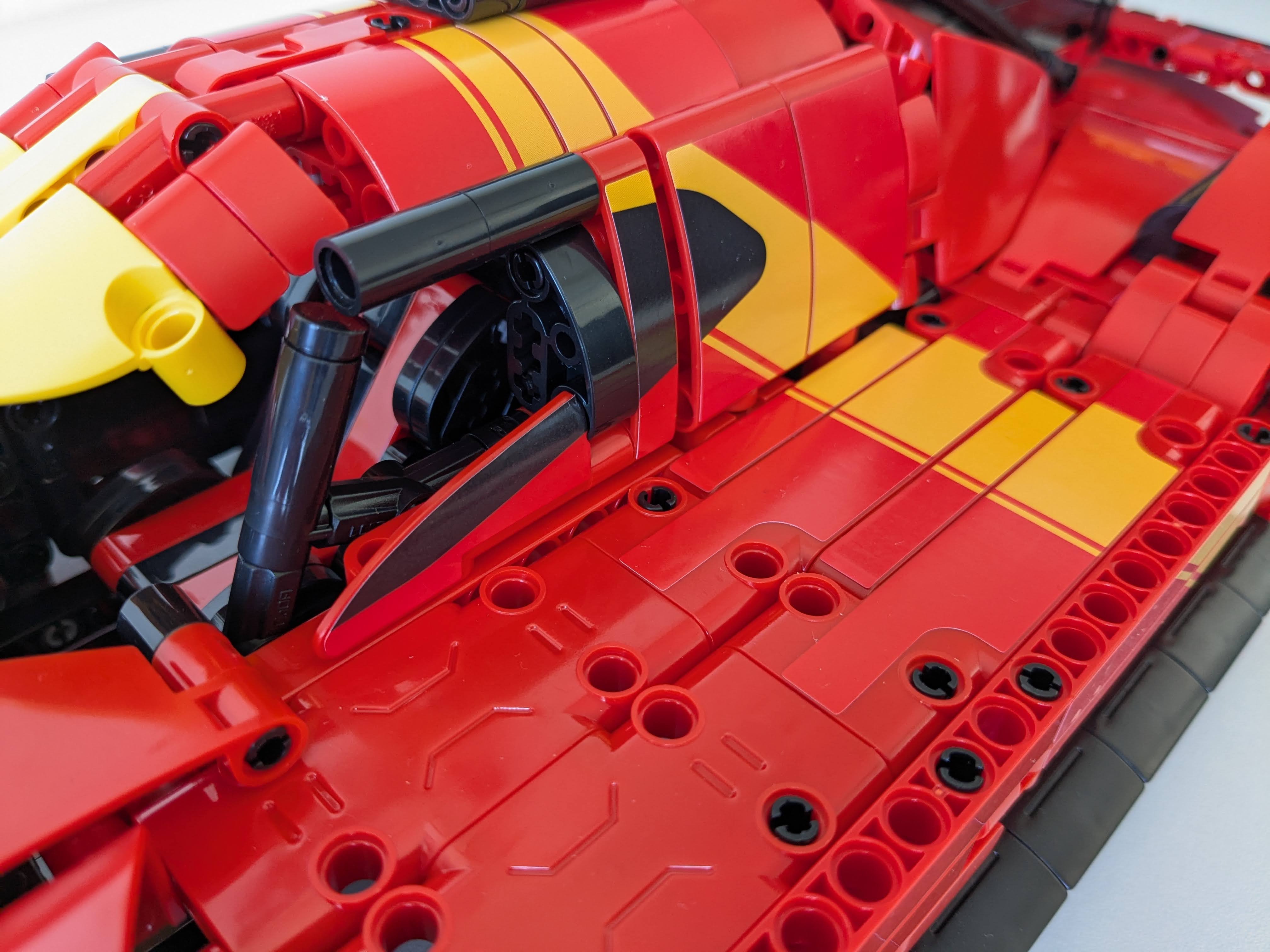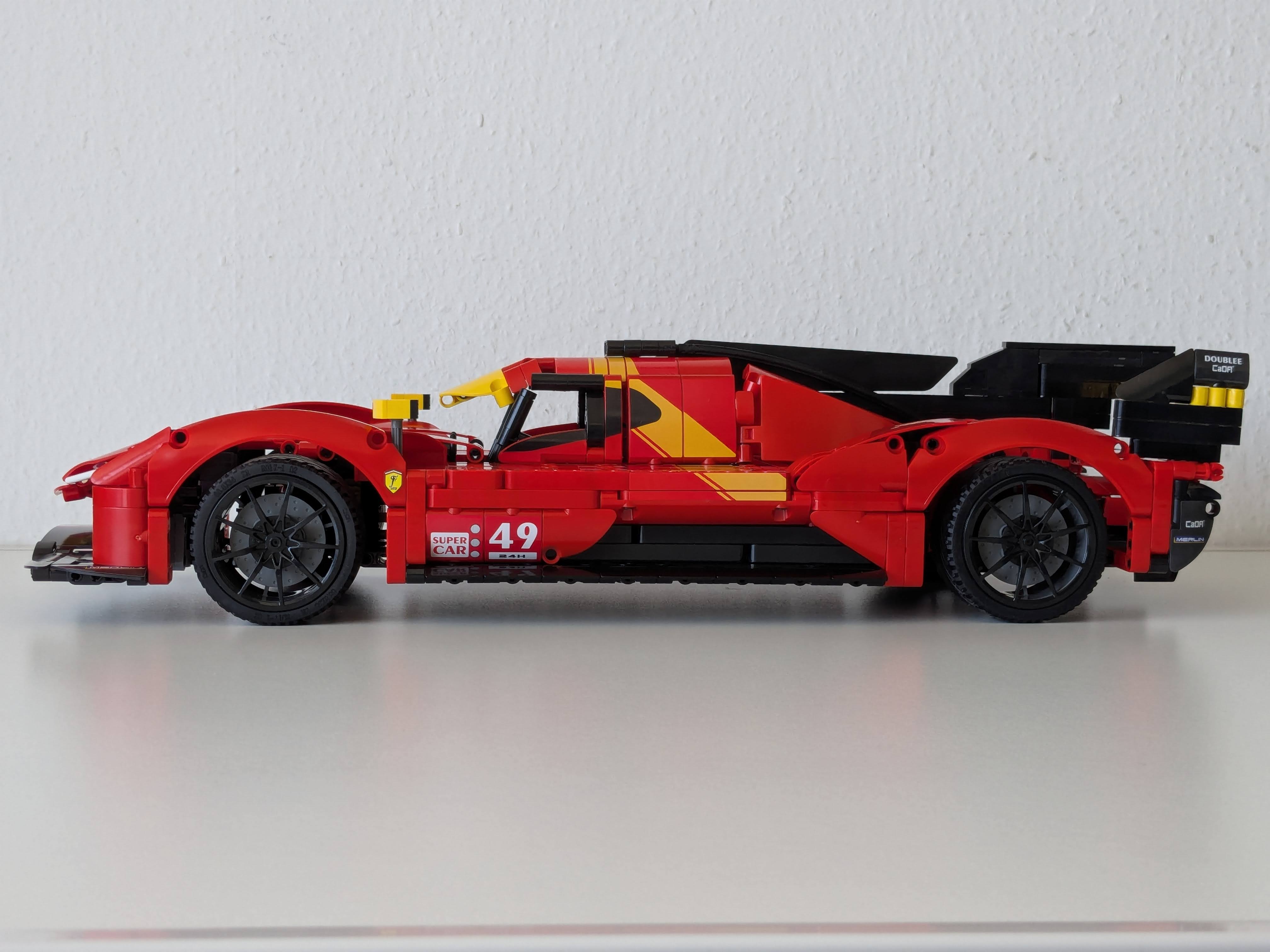 The CADA C63008 Blazing Flame is a solid, good-looking set that closely captures the design of the real car it's based on. The model is very sturdy, nothing falls off or shifts when you handle it. The wheel design is spot on, adding to the realistic look. The build process is smooth, with no awkward or forced steps, and everything fits together well. There are a few downsides. The car sits quite high, especially at the front. I made a small modification to lower it slightly (see photos), but even with that change, it still sits noticeably higher than the real car. The doors also flex a bit in the original design, though I adjusted mine so they sit cleanly without tension. Sticker placement is tricky: the instructions tell you to apply them at the end of the build, which is nearly impossible. It makes more sense to apply them during the build while you still have access. The stickers themselves are difficult to position accurately, with almost no margin for error. I managed it with only one small misalignment. The set is not officially licensed, so some sticker details don’t match the real vehicle, the “49” sticker in particular, feels out of place. The rear engine cover doesn’t open, and the rear light hose is slightly too short, barely holding on at both ends. Despite those issues, the end result is visually very strong. With a few small adjustments, this becomes a fantastic display model. If you like the look of the car, it’s well worth picking up.