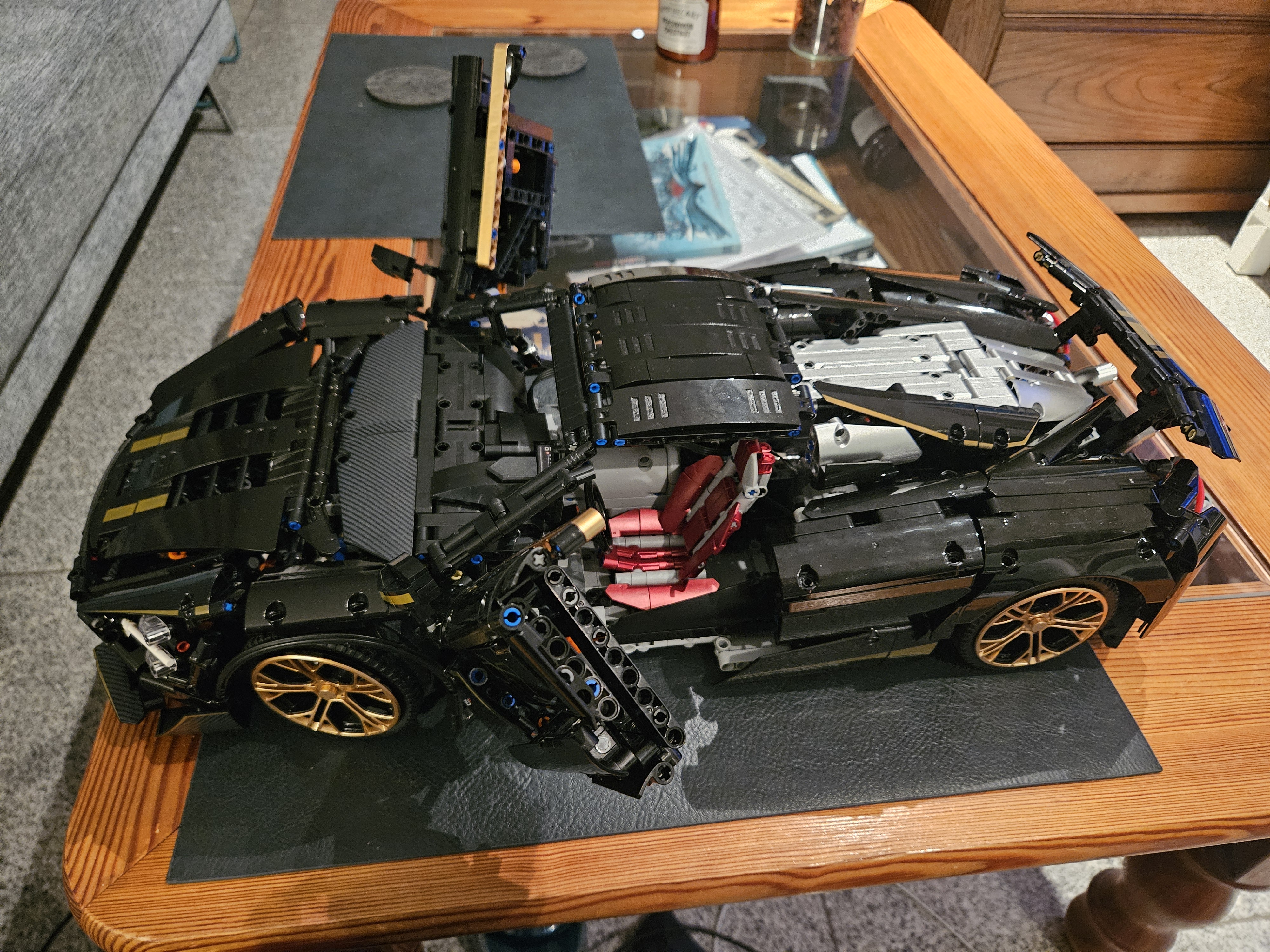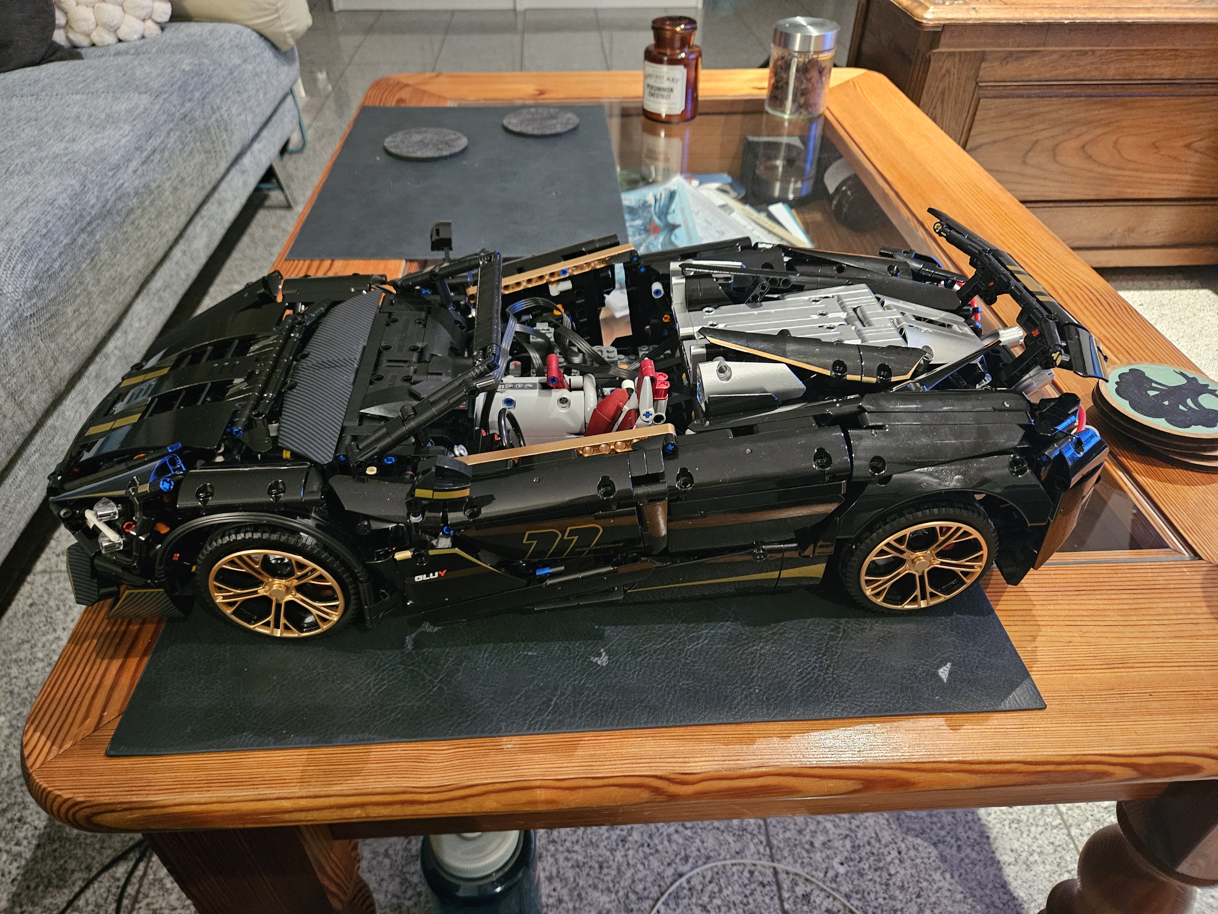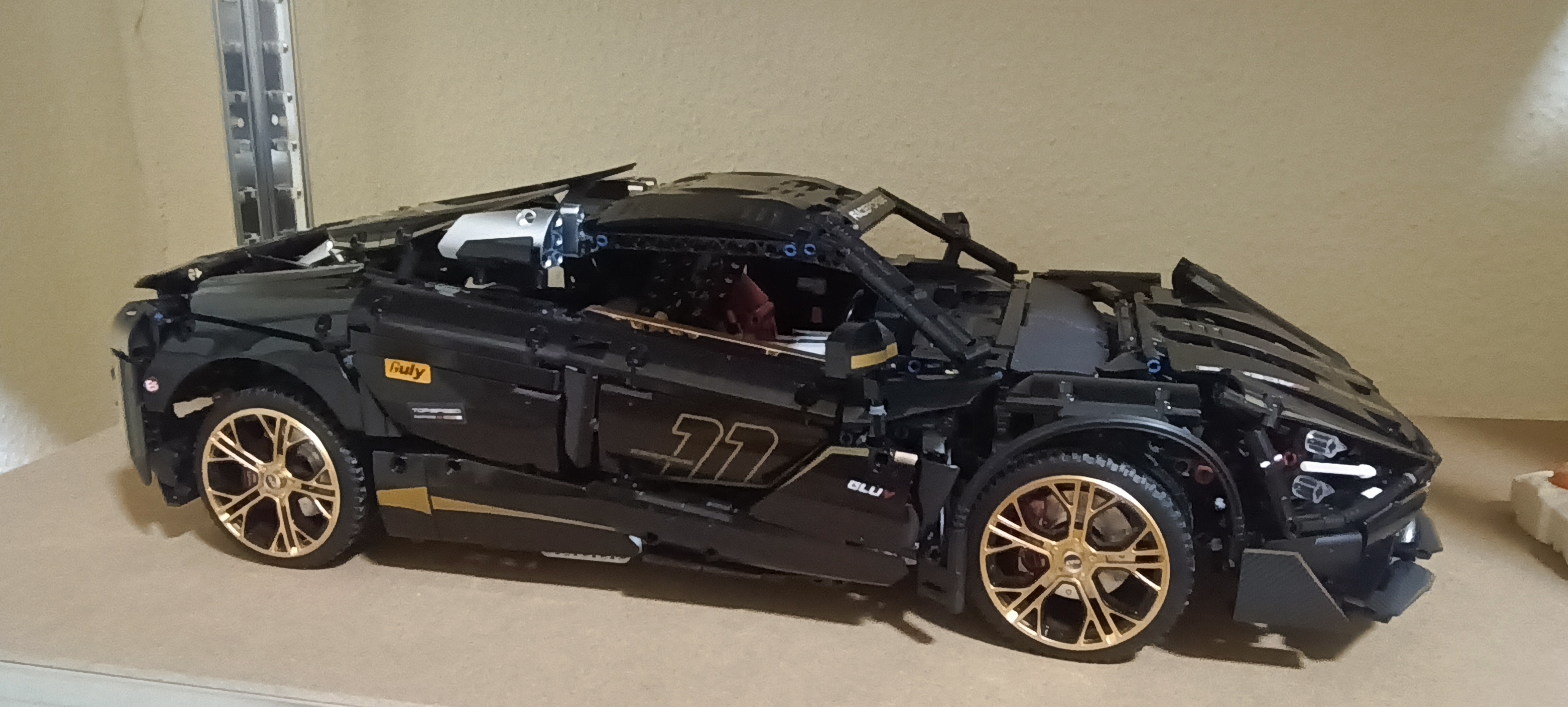 Stunning looking model. Most parts are printed, this version has a black sparkling painting on most parts, aswell as gold and metallic parts. Tons of functions included, besides driving and stirring it can motorized open the doors, be lowered and raised in suspension height, can open the roof, and has LED. It has also a clutch system where you can put the car into neutral or forward drive. The rear wing can also be adjusted via a gear. And the car has a suspension Part quality was absolutely fine, shipping came without any problems.