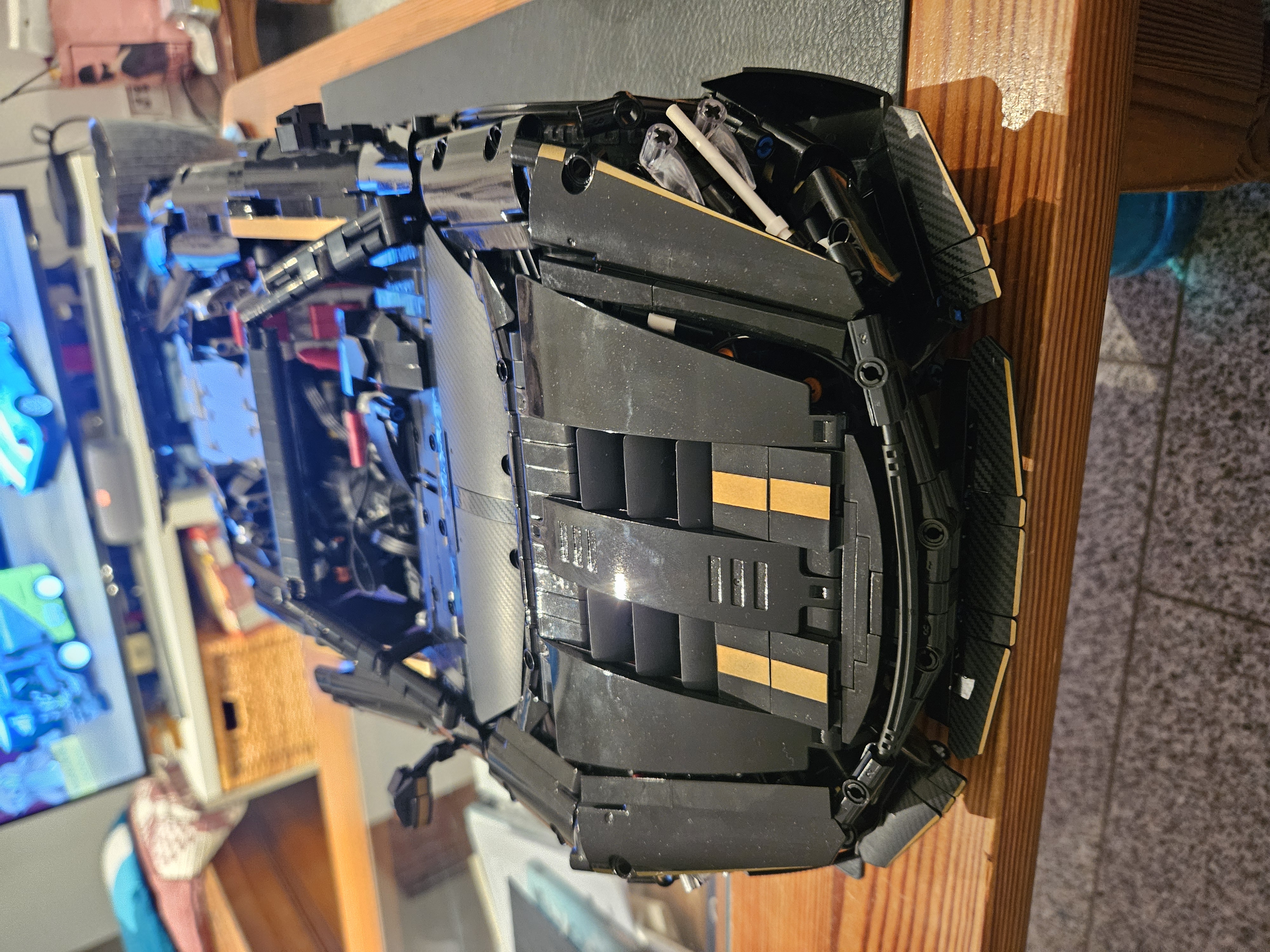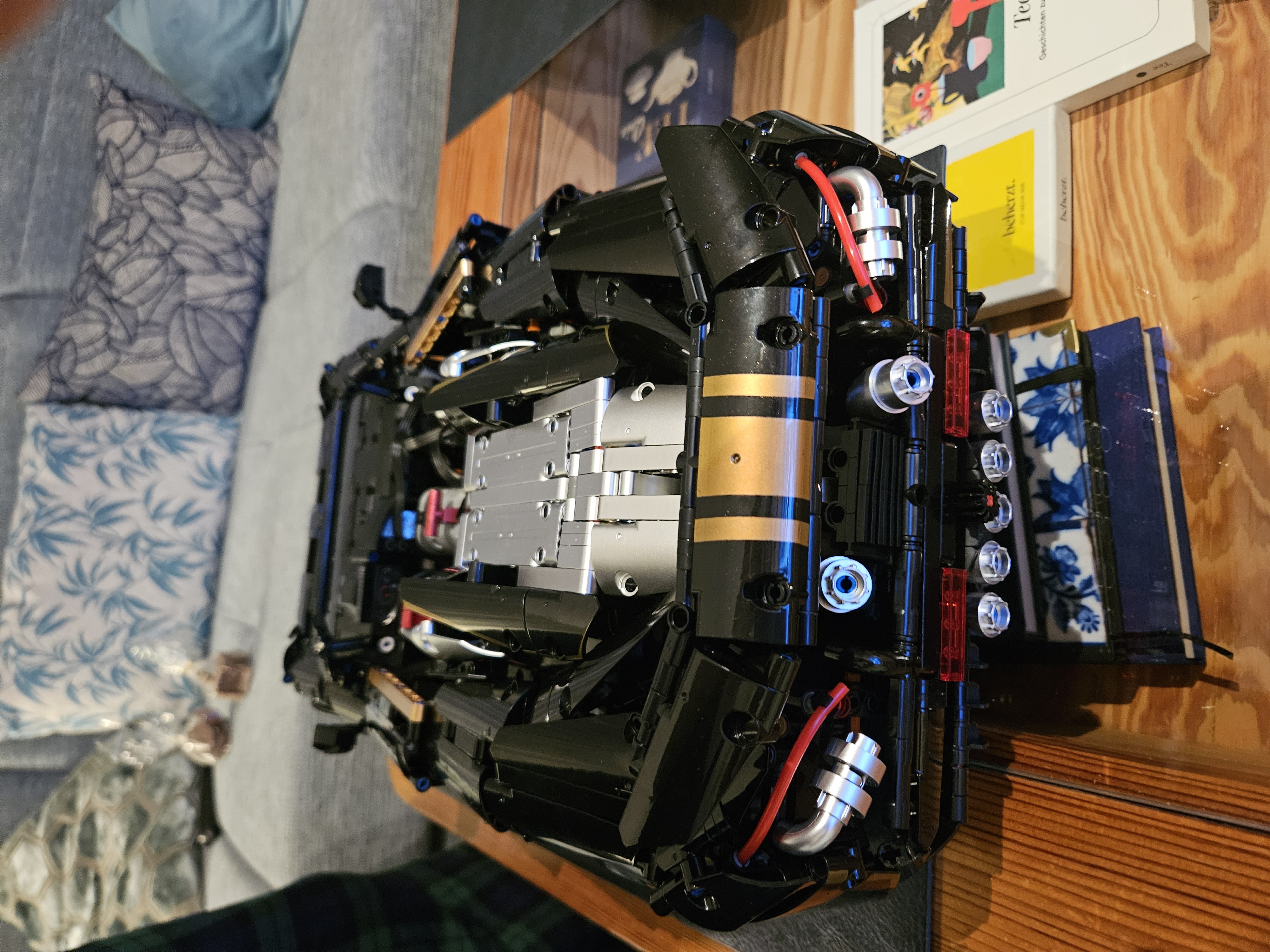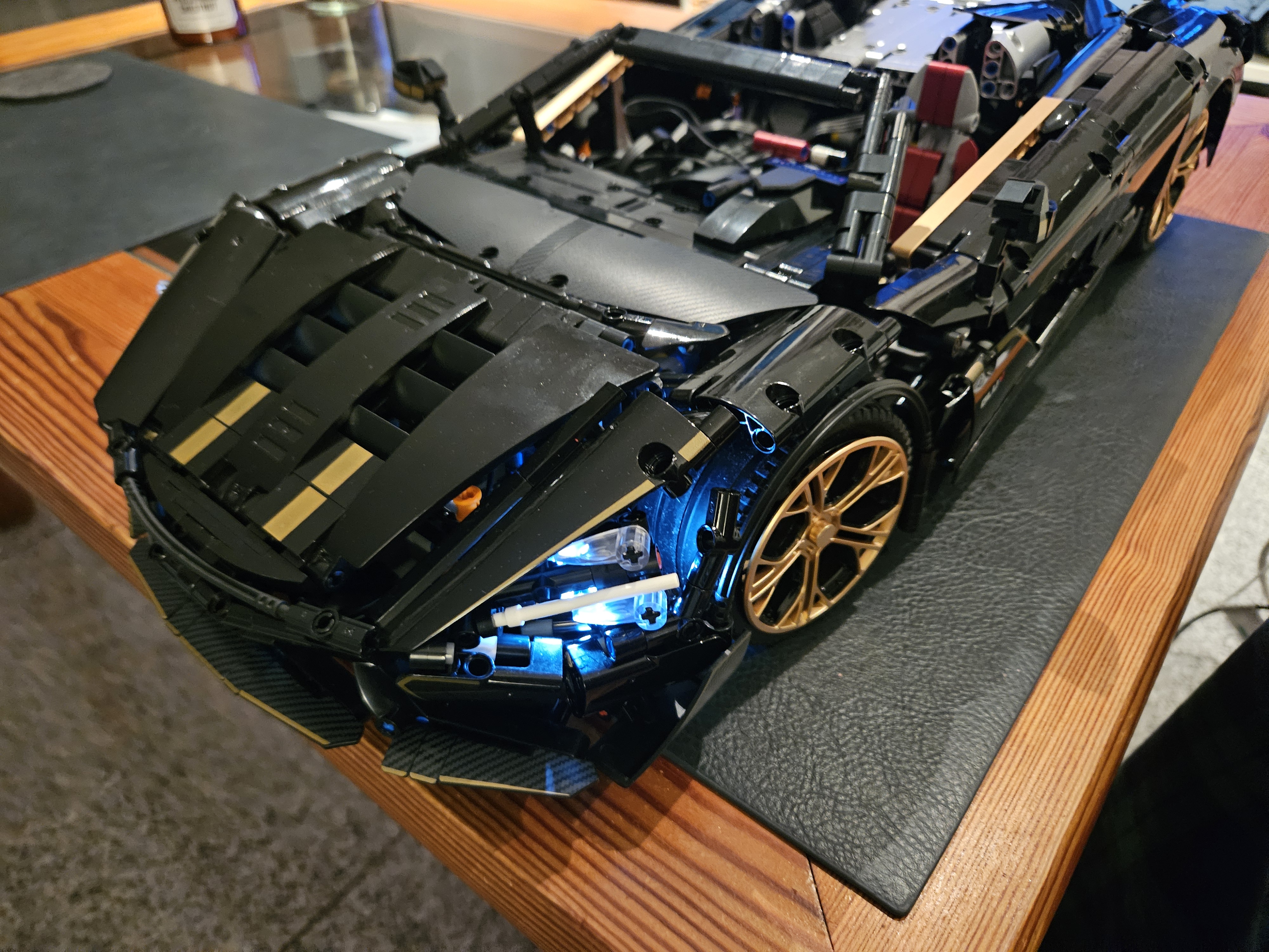 Stunning looking model. Most parts are printed, this version has a black sparkling painting on most parts, aswell as gold and metallic parts. Tons of functions included, besides driving and stirring it can motorized open the doors, be lowered and raised in suspension height, can open the roof, and has LED. It has also a clutch system where you can put the car into neutral or forward drive. The rear wing can also be adjusted via a gear. And the car has a suspension Part quality was absolutely fine, shipping came without any problems.