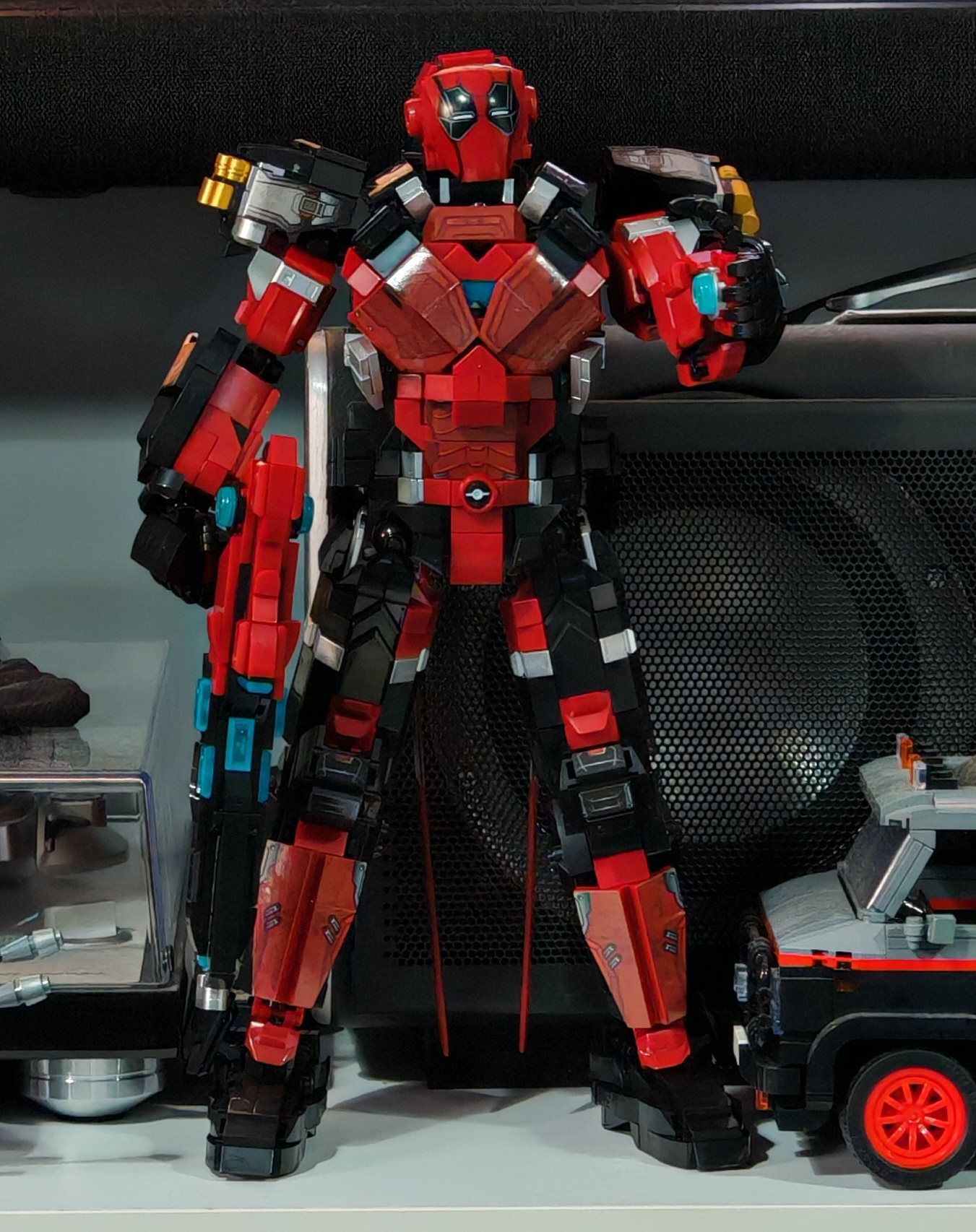 This is a great design. I lost the joint lottery with a bad hinge but I'm not mad at it. The one design flaw that I'm not impressed with is the gun. It's very large and therefore heavy, and it's attached to DP's hand by a single pin and it just rotates around in his hand. There's little to no posability with him holding the main weapon. Because of that, and compared to the other Iron Builds from LY, I can only give it a 3