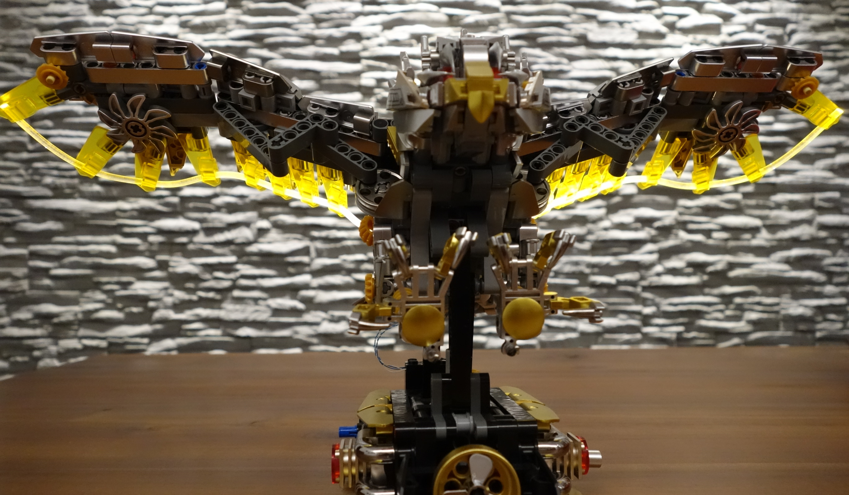OK I have to say I love those MJI mechnical sets. They actually are among the favorites of all sets I own. There are 2 reasons for that: 1) They are really interesting to build as they are kinetic models that have a mechanical function included. Turn the handle (or attach a motor) and parts of the model move in a pretty realistic way. You can even learn a bit about engineering that way. 2) They look great on the shelf with their steampunk style. Lots of metallic or transparent parts, lots of printed parts and even an included illumination make them good display pieces. About this set in particular: This model shows a realistic wing flapping motion (if you turn the handle in the right direction) and also has some rotating parts on the back and in the base. The different shades of silver and gold fit well with the transparent yellow parts and warm white illumination.