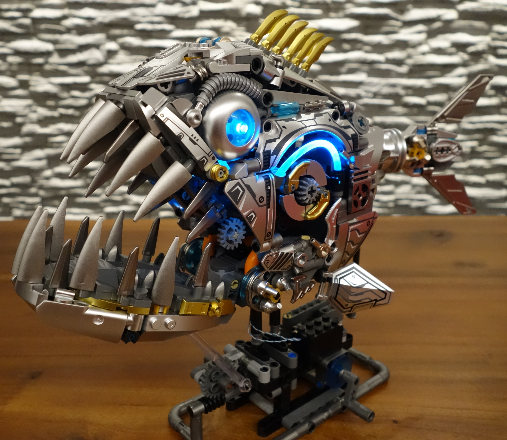 OK I have to say I love those MJI mechnical sets. They actually are among the favorites of all sets I own. There are 2 reasons for that: 1) They are really interesting to build as they are kinetic models that have a mechanical function included. Turn the handle (or attach a motor) and parts of the model move in a pretty realistic way. You can even learn a bit about engineering that way. 2) They look great on the shelf with their steampunk style. Lots of metallic or transparent parts, lots of printed parts and even an included illumination make them good display pieces. About this set in particular: A lot of big teeth in this model. The movement covers the mouth and tail while the deep blue illimination lights up the eyes to great effect.