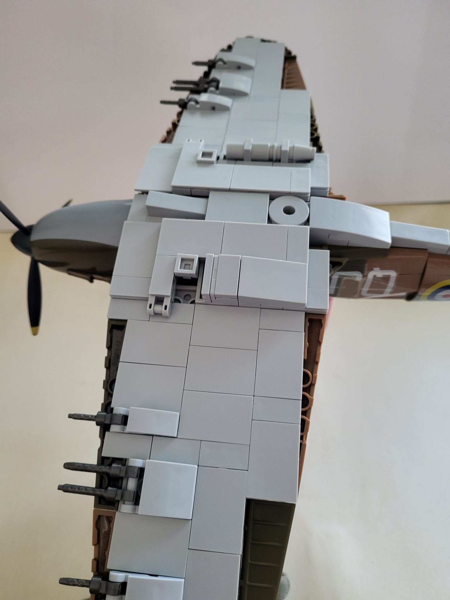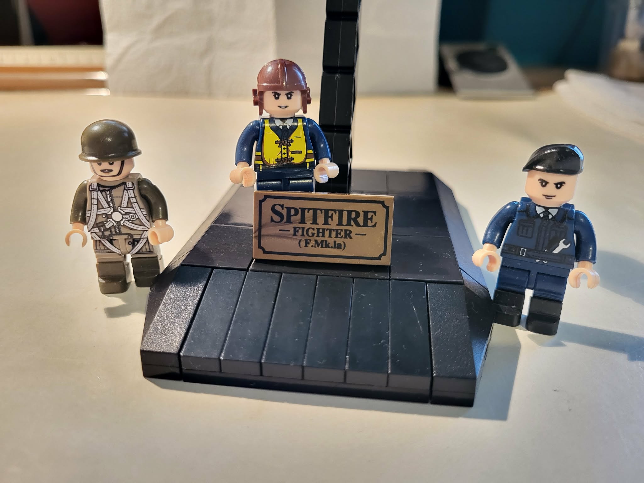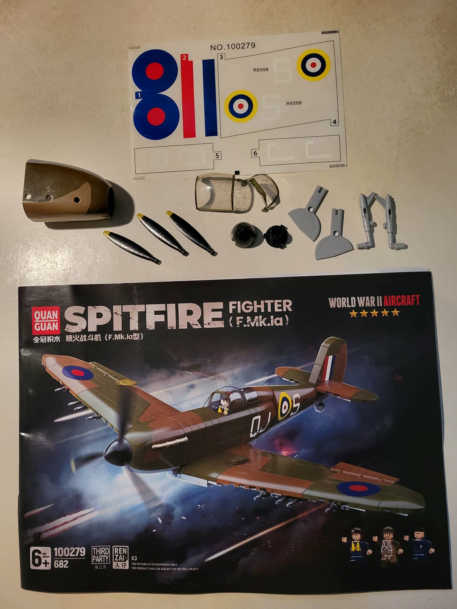 Quan Guan British Spitfire Ordered from YourWobb for 拢15. Delivered to UK in 10 days. Approximately 700 pieces. This is my first Quan Guan build. Instructions were not the easiest to follow, you really had to put the pieces together in reverse order. The pieces are not great quality, and there are lots of red frustrating pieces that are used for attaching pieces together, they are quite tricky/frustrating to get in place. Overall reasonably happy with final build, took probably about 4 hours as instructions take a bit of studying at some points. The base is very fragile and i think the nearest knock or movement and the aircraft is falling off it. The attachment to the stand base and aircraft are not very secure. Stickers again were not very good, it isn't too bad if they are on 1 panel, but if spread over multiple you can clearly see them. The minifigs are fine, the middle one in the photos i have a hard time to get him to stand. Lots of tools, etc for the minifigs too. I was left with around 30 pieces once aircraft and stand were built. Had the name plate for their P-51D Mustang too. 4/5 for value as low cost, 3/5 for final build.