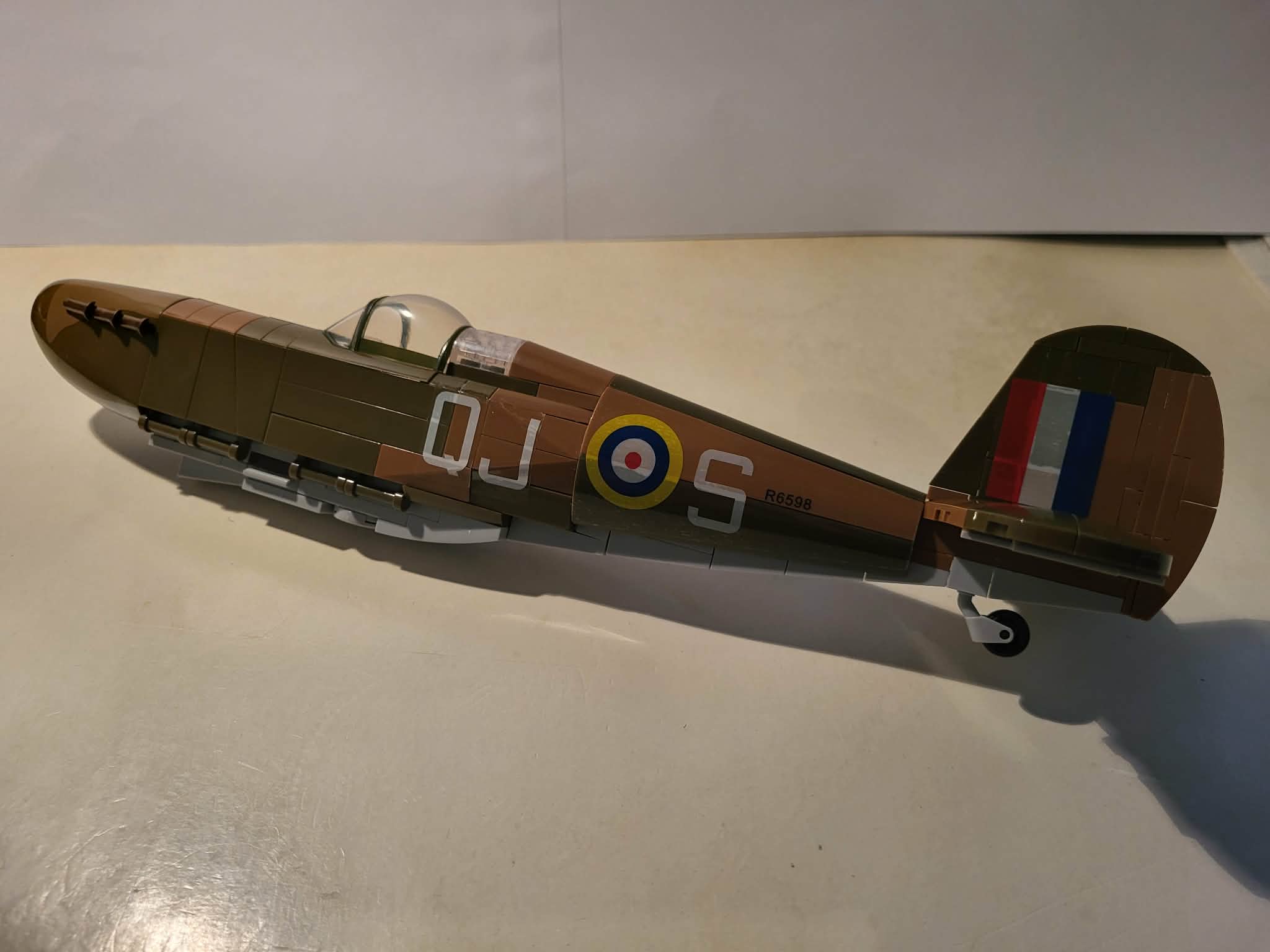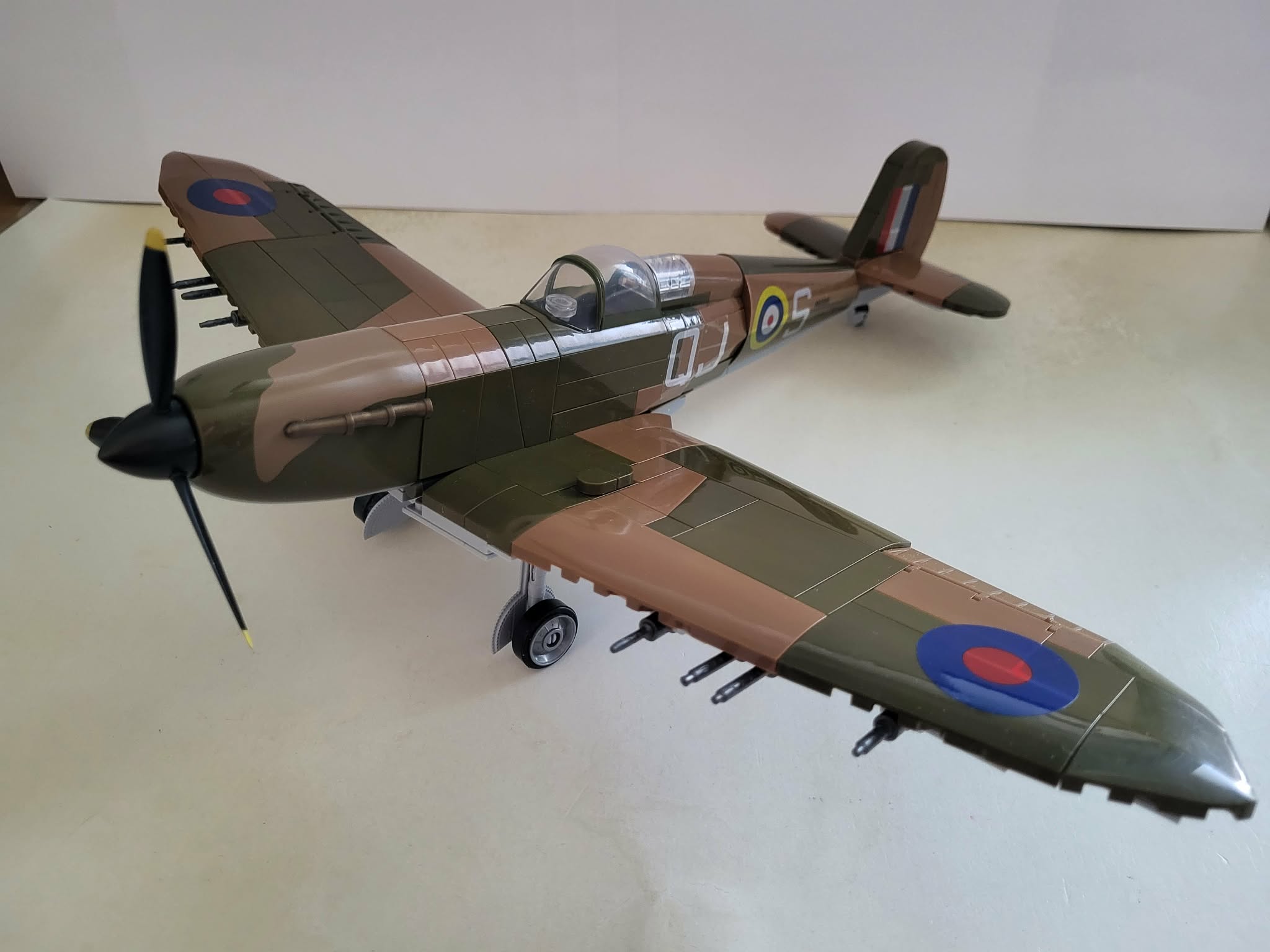 Long awaited, the Spitfire is finally here! The figures are typical QG nice, but I'll be replacing them with custom figures. First, I need to sort the parts, and then I'll get started. So far, so good. Unfortunately, six parts were missing: four 1x1 tiles and two 1x1 plates, which dampened my spirits a bit. Luckily, I was able to replace them, more or less in terms of color, with parts from a Danish manufacturer I'd actually hoped to avoid. It's a shame; up until now, I've always had some leftover parts with their models, but never any missing pieces. I really hope that QG's models will be complete in the future! Oh man, the stickers on the sides are a real pain, but I managed it. My nerves are shot, but on I go, because despite the pain and the gaps, which are sometimes quite large, I already really like it. Now for the wings. Yes, they were actually straightforward and fit really well once attached. I really have to commend the construction method! Applying the two stickers was quick and easy, and the underside is also quite simple and looks really great. Now all that's left is the sprung landing gear, and it'll be finished. Regardless of the missing parts and the sticker issue, this kit is definitely a must-have. The Spitfire is a fantastic addition to any WWII aircraft collection and highly recommended!
