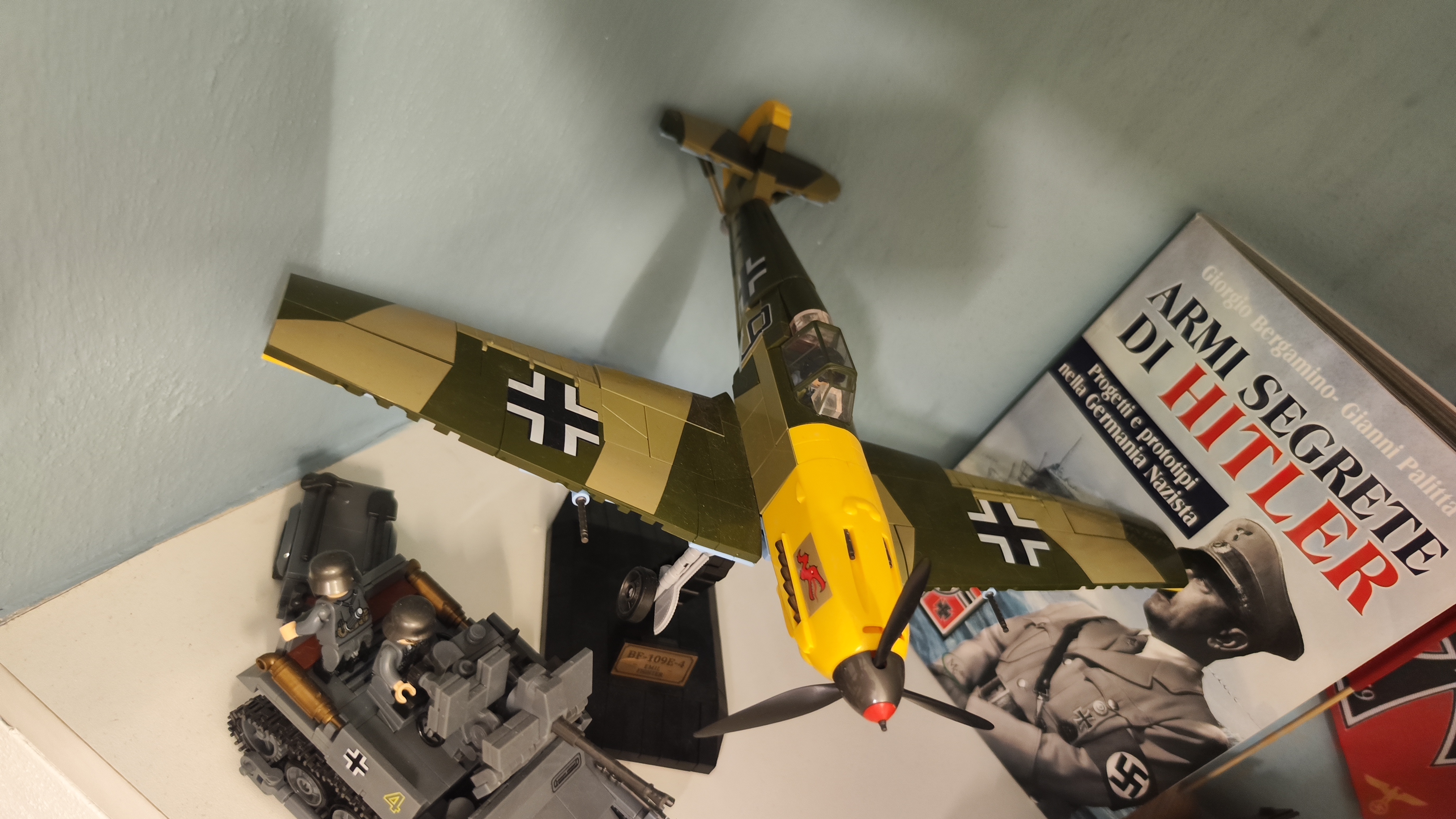 Due to less than positive experiences with Quan Guan, I considered purchasing more models, but I couldn't resist buying the Bf109 E3 Emil. Unfortunately, the first eight bags weren't numbered, so I had to unpack and sort all the parts and start building right away. The parts are of typical QG quality, so OK. Everything was there, fit perfectly, and I admit I couldn't stop building because the more I built, the more I was proven wrong. The only thing that really annoyed me were the stickers, because they were on my last nerve, and you need those and very steady hands for them. But all in all, once the plane was finished, I was completely hooked and flew around the apartment with the sound of the engine and the model in my hand. And the best part, as you can see, is that the undercarriage even has suspension. A highly recommended QG model; I love it and am already looking forward to the Spitfire!