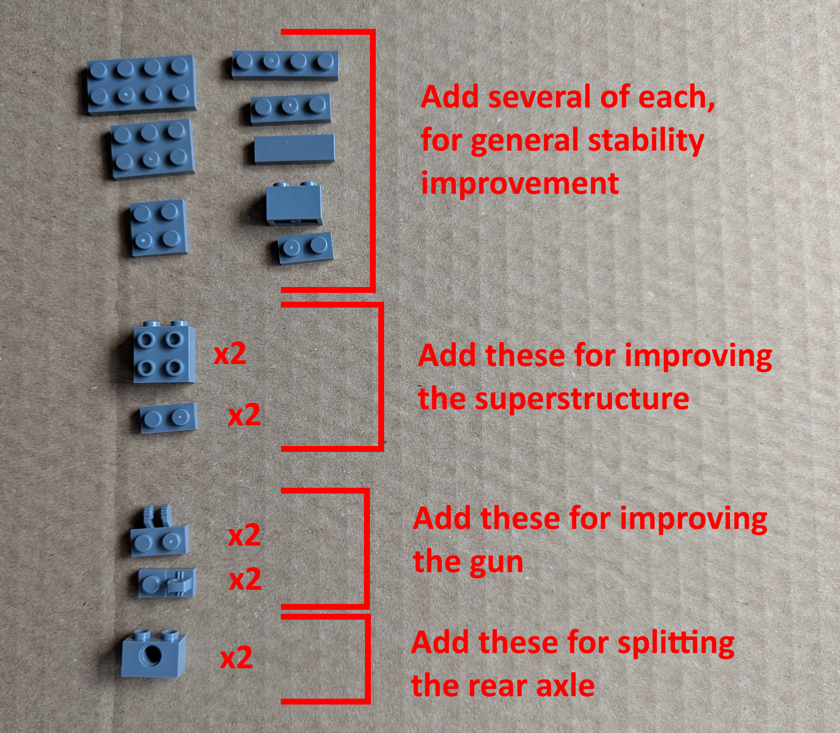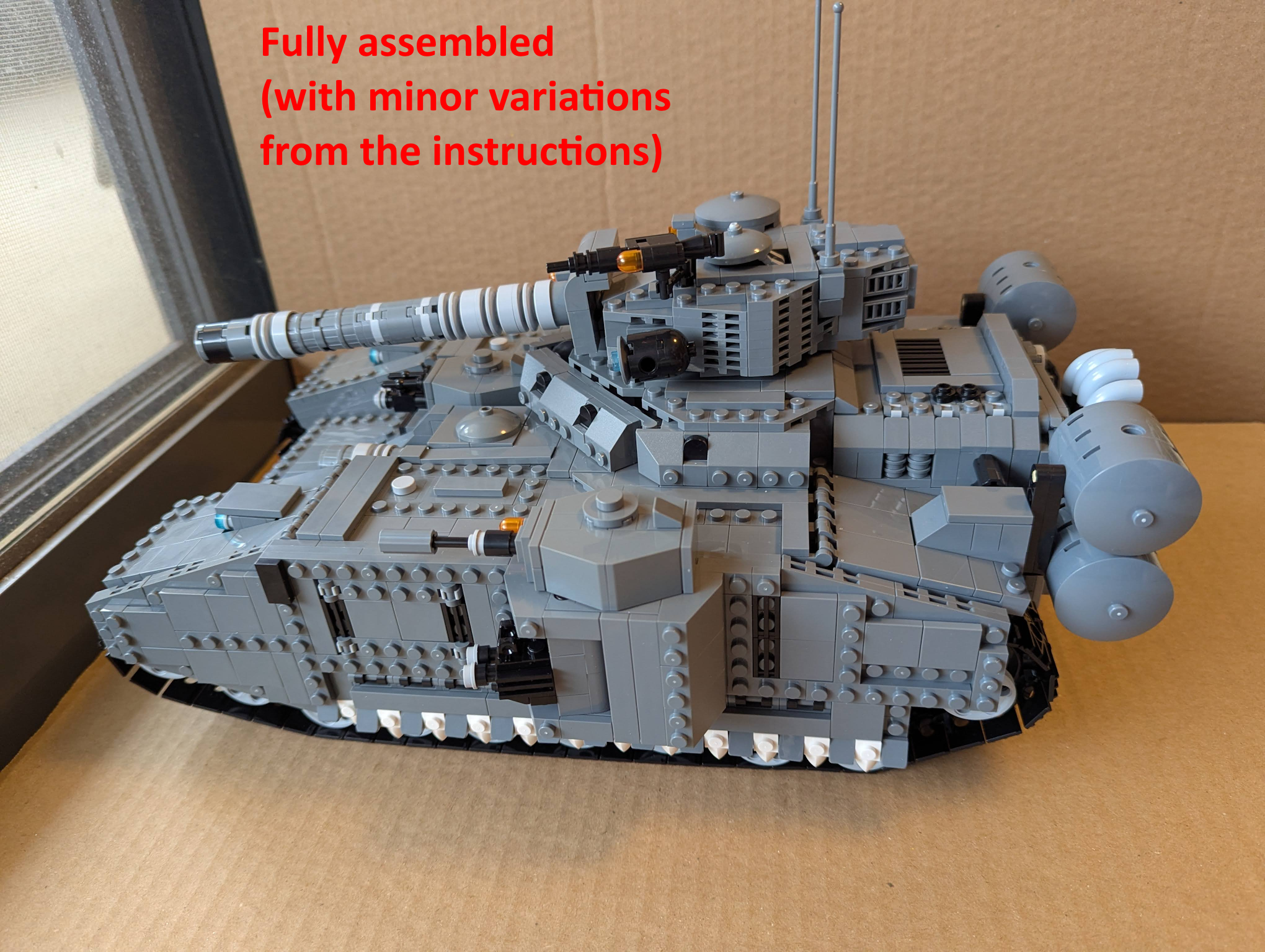 You need to have the right approach with this one. First, the description says that is a complicated build, not suited for beginners. This is not boilerplate text. TAKE IT SERIOUSLY. If you don't feel ready for a challenging build that will test your improvisation skill, you should probably skip this set. If you have experience with complicated builds, my suggestion is to treat the instructions as general guidelines. The model has many unstable parts, and some of the build steps in the instructions are definitely incorrect. So you will need to make modifications and adaptations on the go, change the build order, and probably sacrifice some of the cosmetic elements for extra durability (or order some extra parts. See the third image). Also, the rear axle is linked (meaning the tracks can't spin separately). If you want to split it, see the third image again. So if you are up to a challenging build (and you don't get any important missing pieces, which I did), you will be rewarded with an amazing looking Baneblade tank. All the weapons are brick-built (it is a MOC). And it is HUGE.