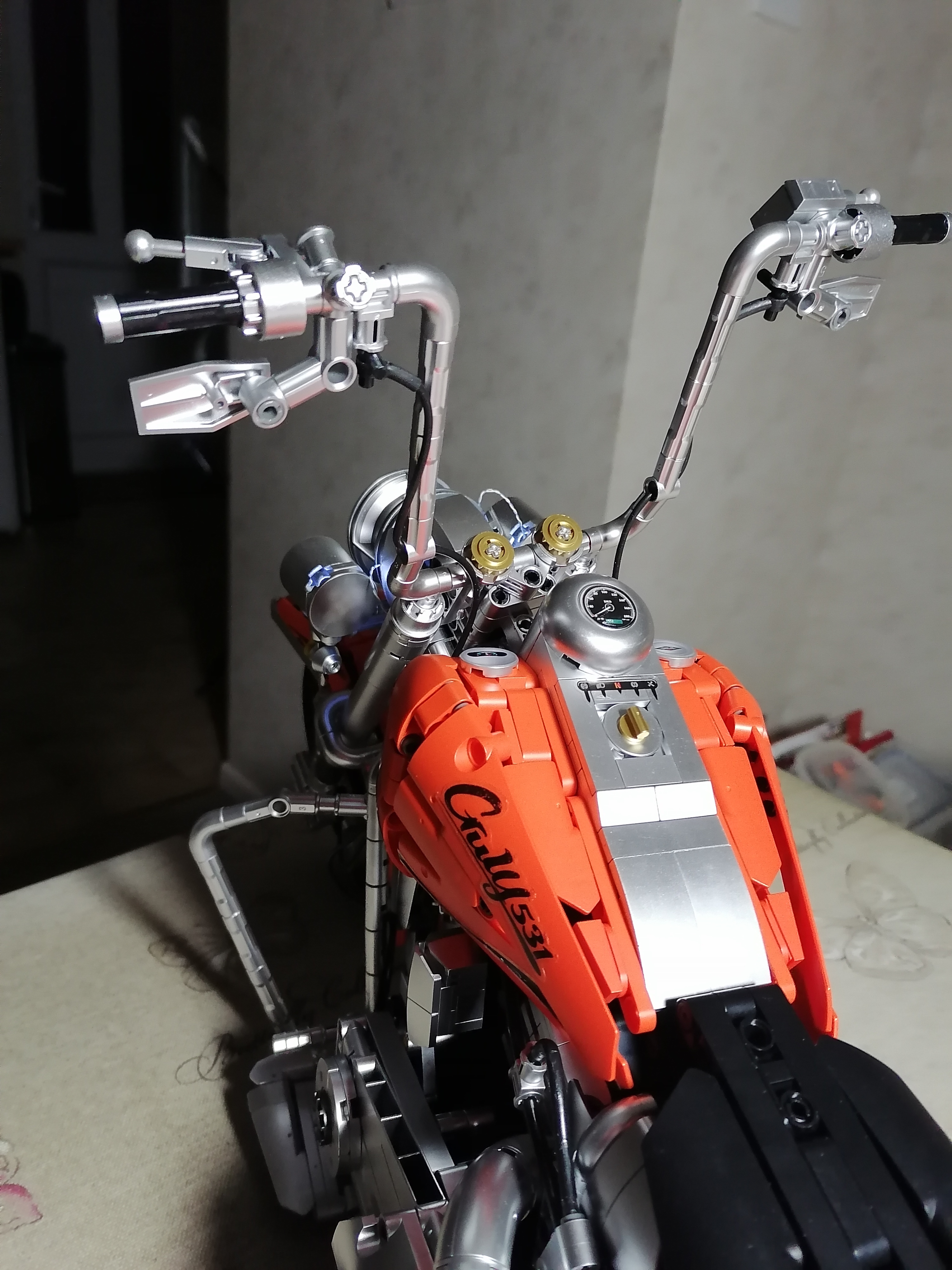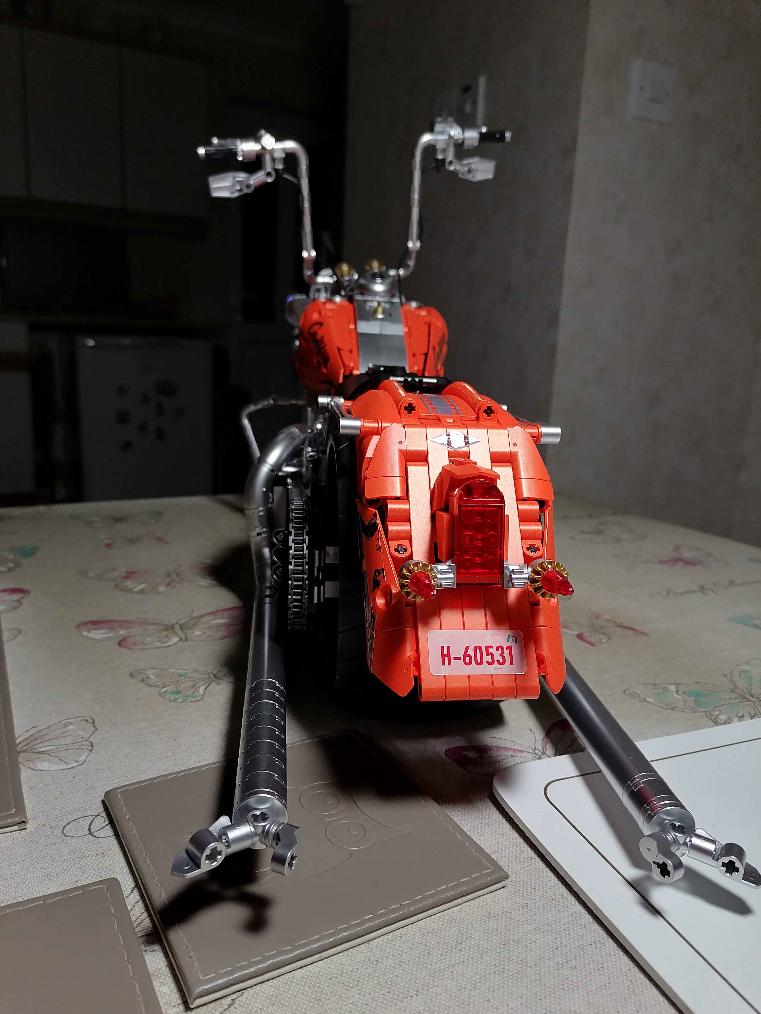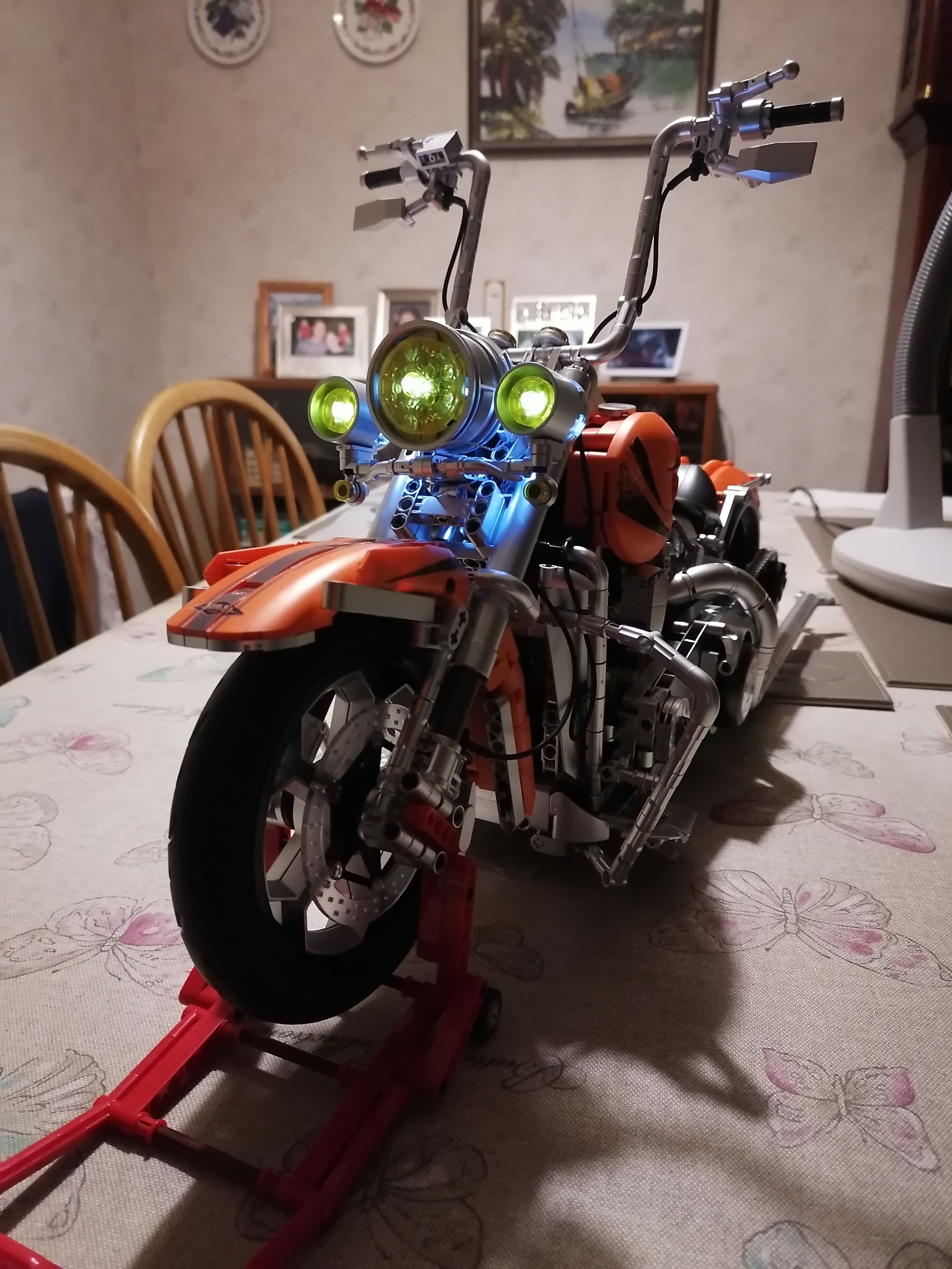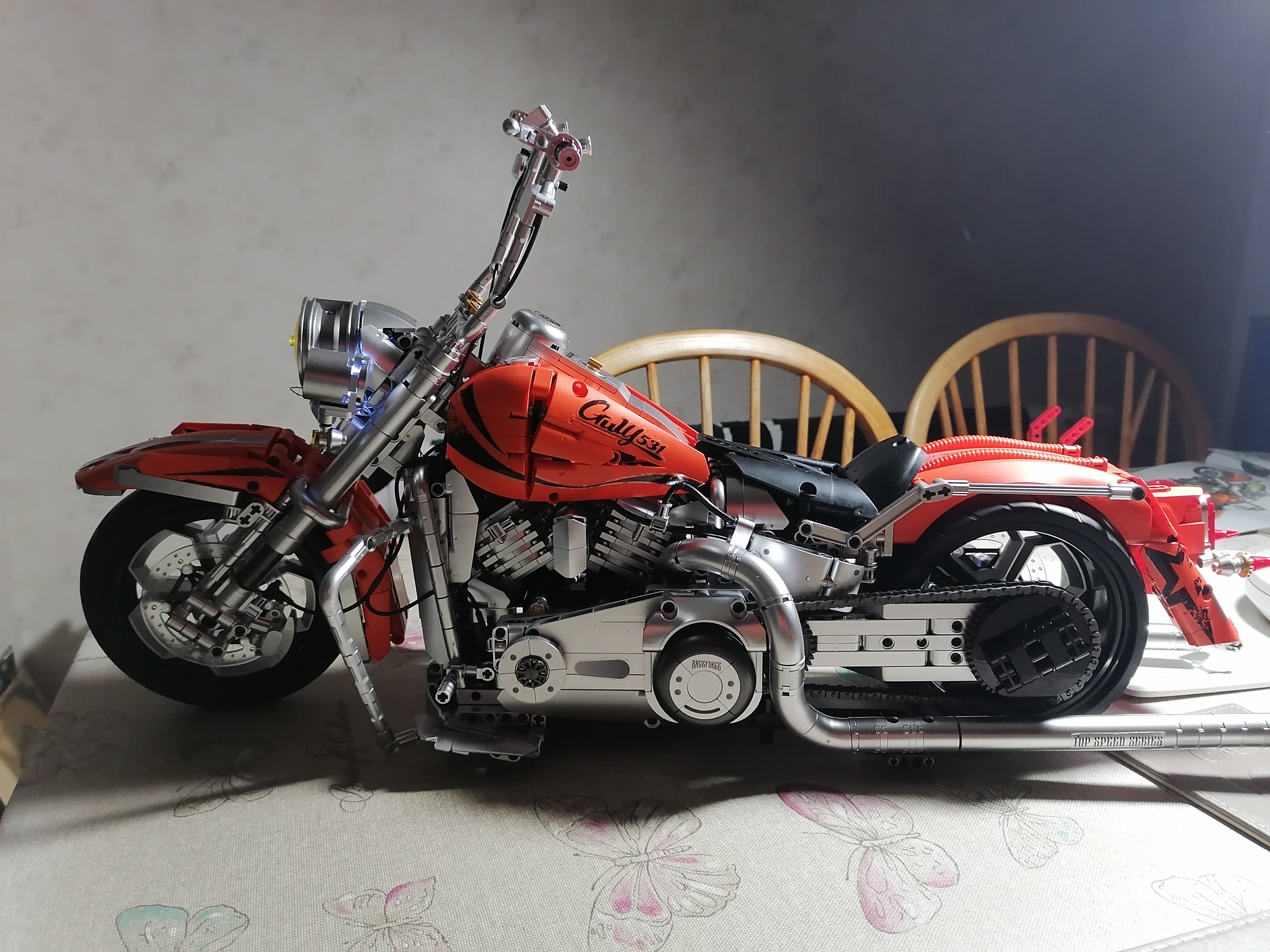 This model had some tough building processes within it. It's not for inexperienced builders. The orange panels are not metallic as suggested in the discription. The length of the model in the discription said it was 32cm,more like 45cm get it right gully please. The decals are some what cheap, and can break when applied. The end result however for the price is well worth it. The 3 front lights are battery powered. However you need to purchase 3 Lr44 round button batteries which don't come with the model. The silver electroplated parts help to compliment the model. If your an experienced builder go for it. The hardest part to build was the petrol tank, as it was a peculiar shape.