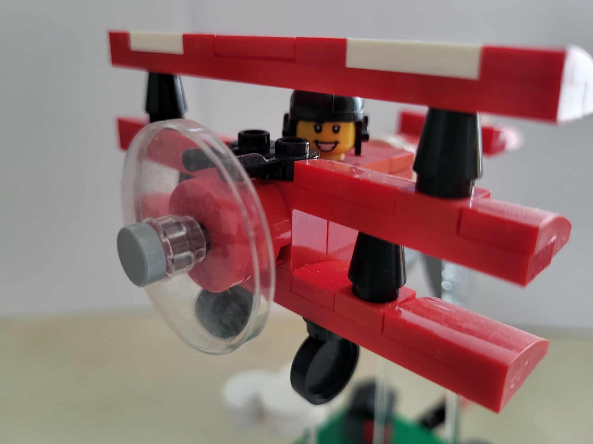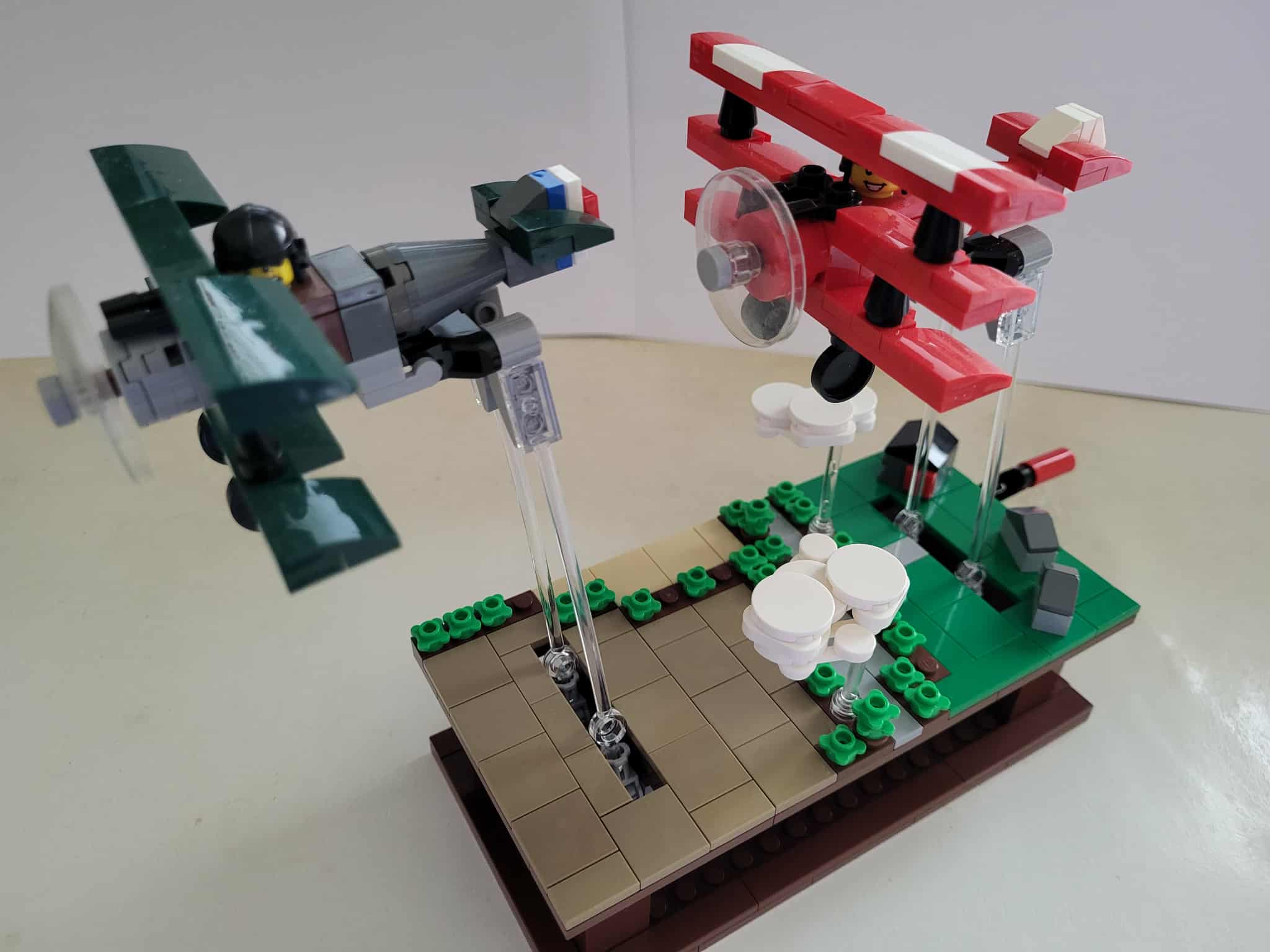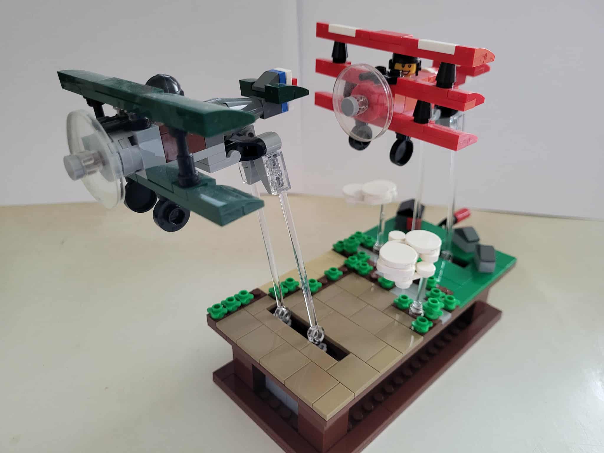 I bought this MOC (My Own Creation) two years ago because I was interested in the topic of WWI aerial combat, but unfortunately, it's currently unavailable. It wasn't very complicated, but it was fun to build. I made a few minor changes to the surface, such as adding two clouds and, of course, two pilot heads. With some modifications, you could also add a low-speed motor; otherwise, the little planes would really fly in all directions through the air ;) It's a nice little model for fans of this genre.