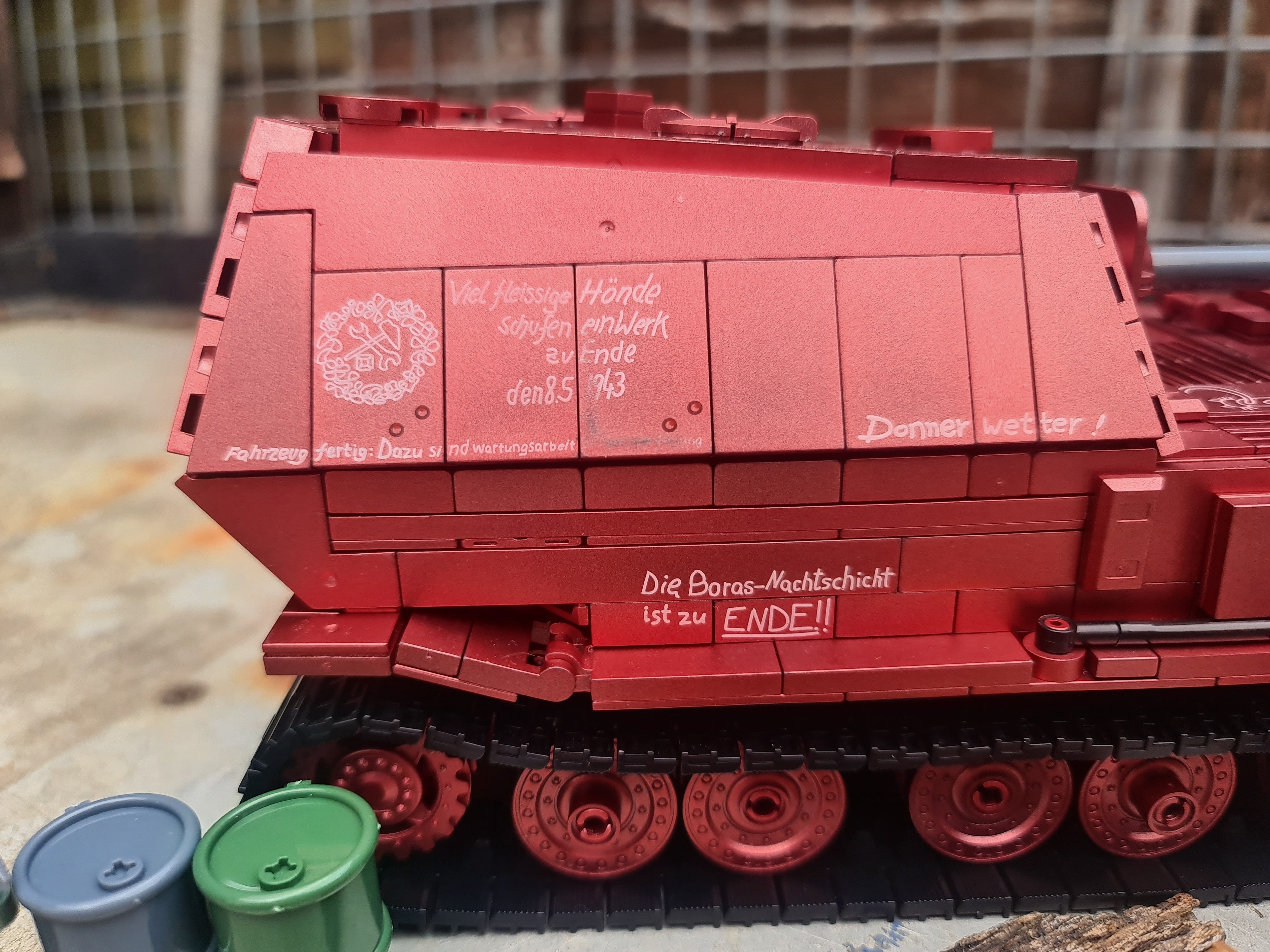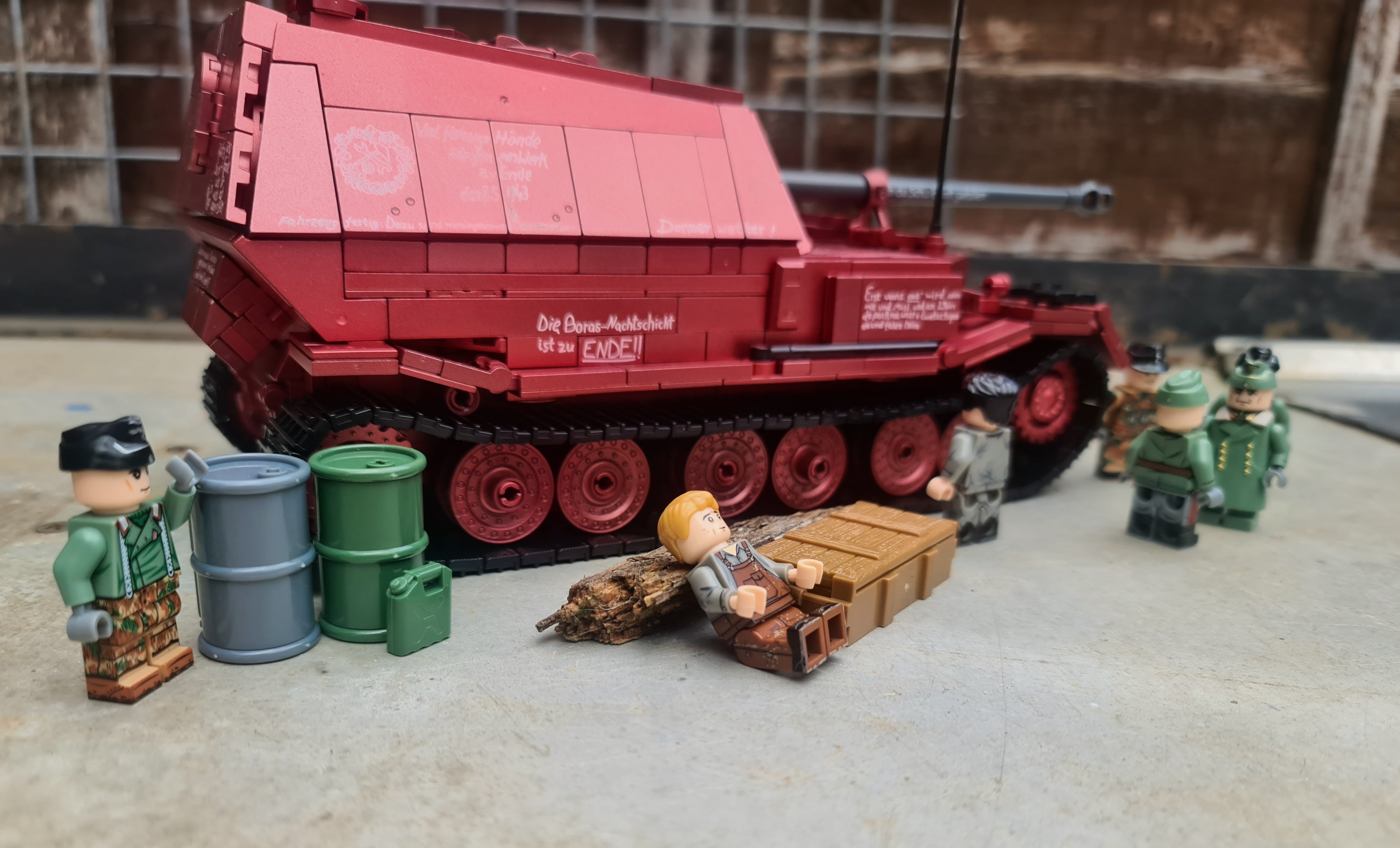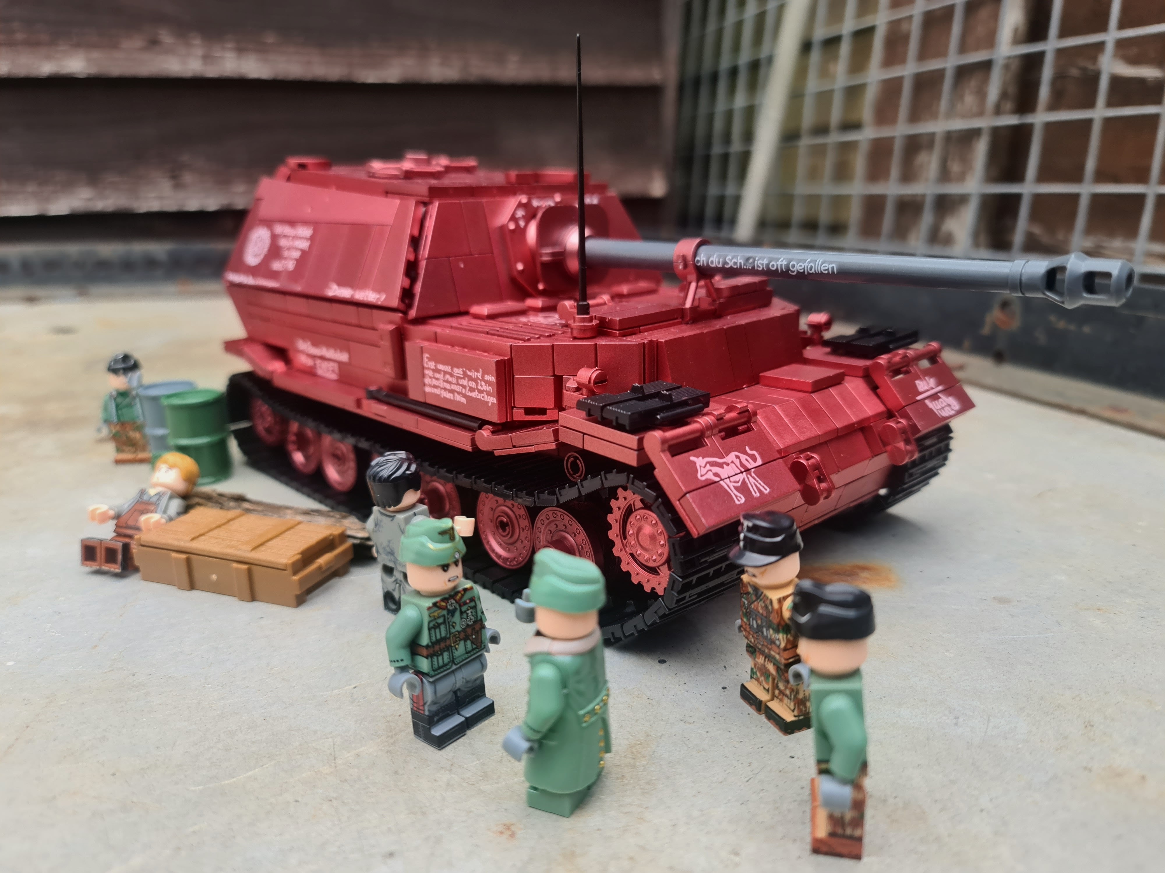 The build quality is excellent overall. The electroplating gives the pieces a premium finish, although it makes them slightly harder to press together than usual and results in minor color variations. The completed tank looks fantastic, and the accessories complement it very well when displayed alongside the model. While a matte red (rust primer) finish would be more realistic, I also like the metallic red color. I did encounter two minor issues: one of the red plates was grey instead of the expected shiny red, but I was able to replace it with a spare part, and one minifigure arm was missing. I would also suggest modifying the suspension, as shown in the last picture, to make it look more realistic.