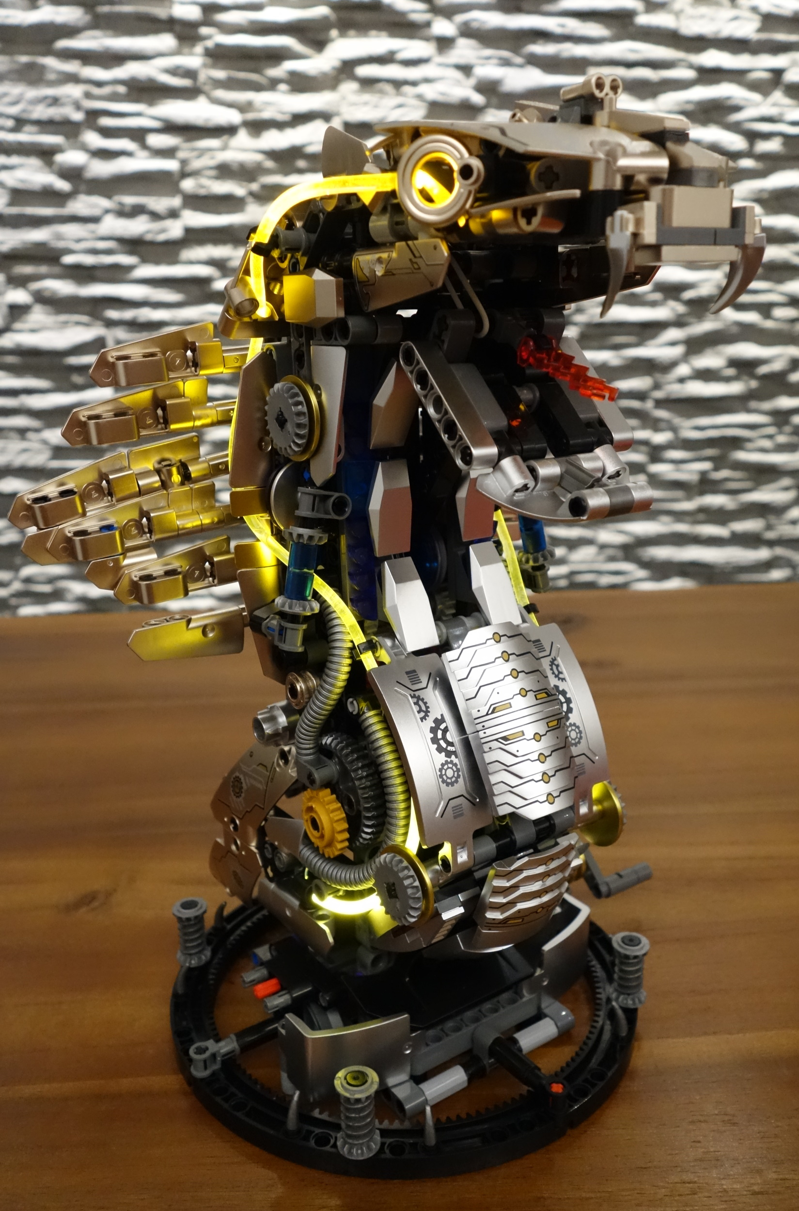 OK I have to say I love those MJI mechnical sets. They actually are among the favorites of all sets I own. There are 2 reasons for that: 1) They are really interesting to build as they are kinetic models that have a mechanical function included. Turn the handle (or attach a motor) and parts of the model move in a pretty realistic way. You can even learn a bit about engineering that way. 2) They look great on the shelf with their steampunk style. Lots of metallic or transparent parts, lots of printed parts and even an included illumination make them good display pieces. About this set in particular: Unlike the other sets in the line, this one doesn't have the complete body but only the head, which is pretty big and impressive. The movement when turning the handle for this model is the opening of the mouth and the spreading of the hood. The warm white illumination is really well done here and actually lights up the eyes.