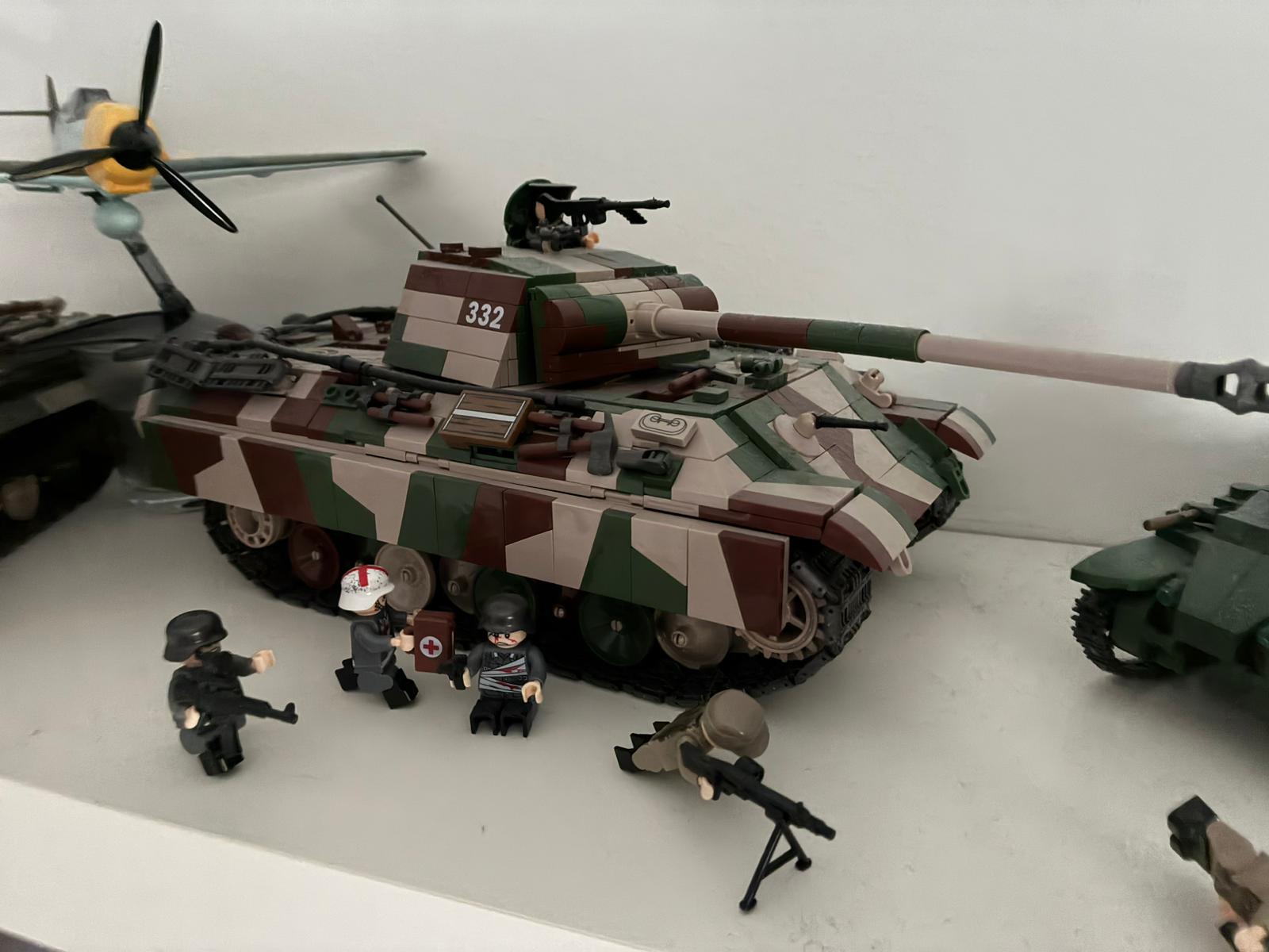 Quan guan 100252 panther kit.finished kit looks really good.about 1/25 scale. Detailed interior(i dont get the point behind building engines or interiors that never get seen) but is a little bit unstable.it was not fun to build.needed glue in some places,some bricks too tight.build was frustrating, no pieces missing on tank but one foot missing from one of the figures but i got a spare arm.